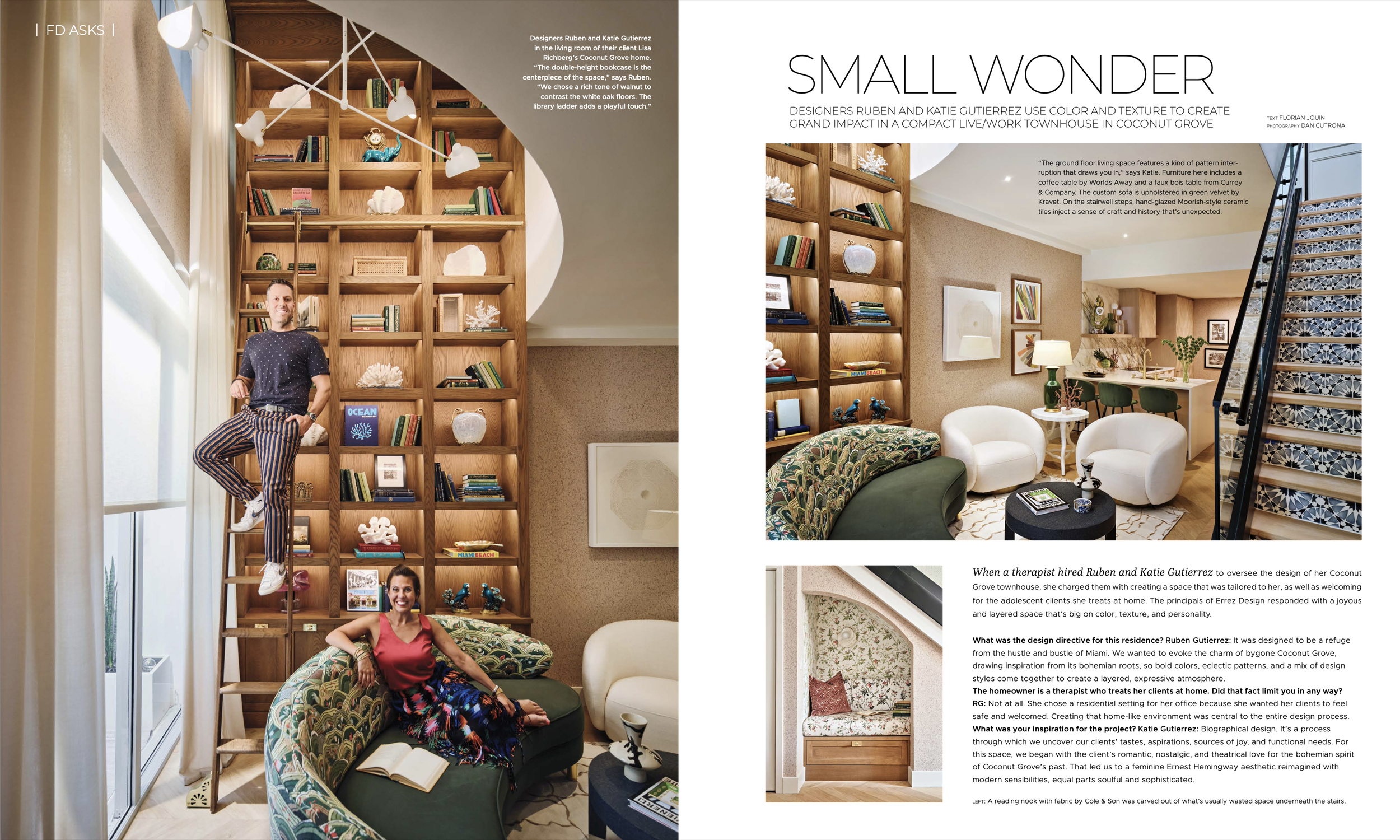 Inspired by a romantic look back at Coconut Grove’s bygone bohemian era, designers Ruben and Katie Gutierrez transformed this compact townhouse into a soulful, multifunctional space for meeting with therapy clients. The project embraces the free-spirited, art-driven energy that once defined the neighborhood—reinterpreting it through a modern, layered, and deeply personal lens.